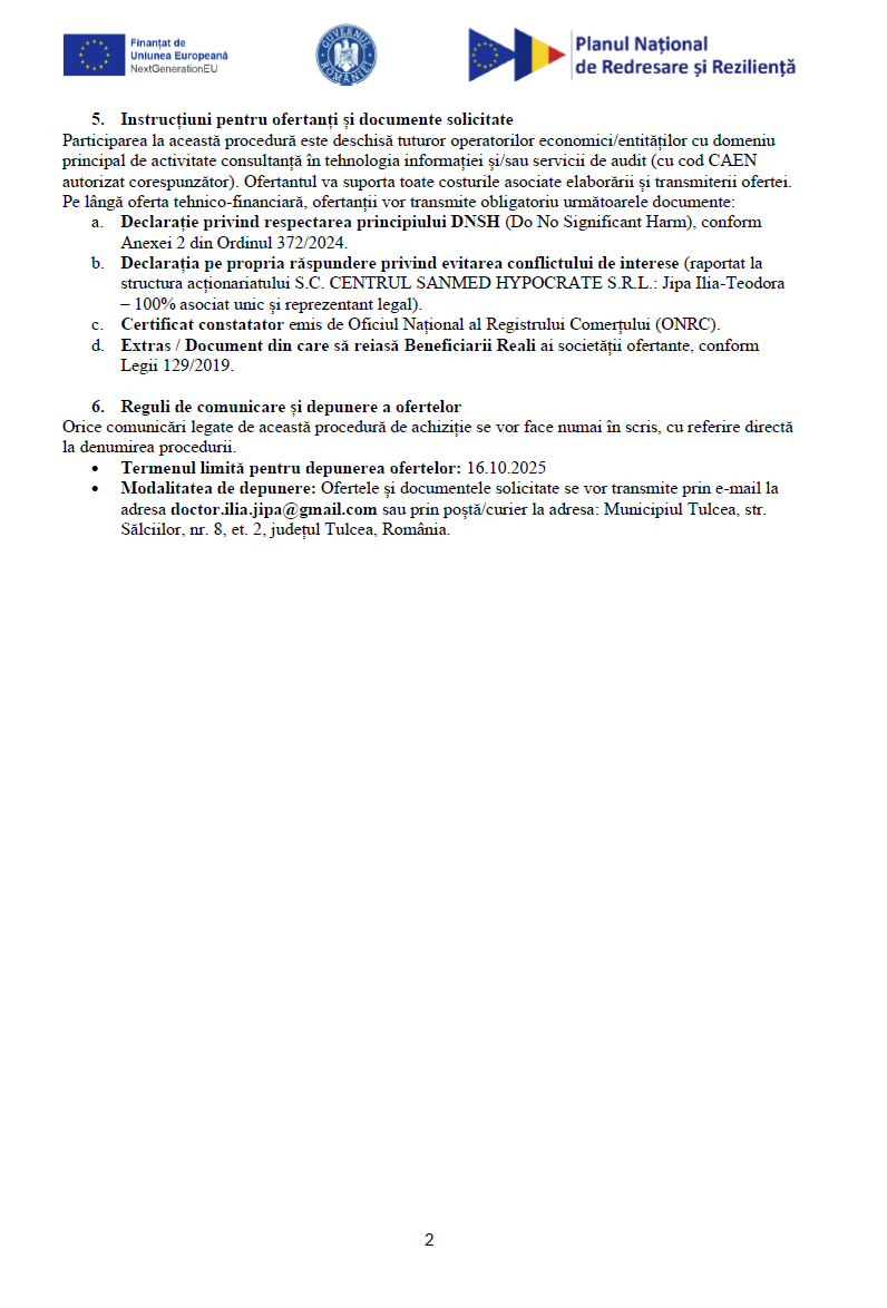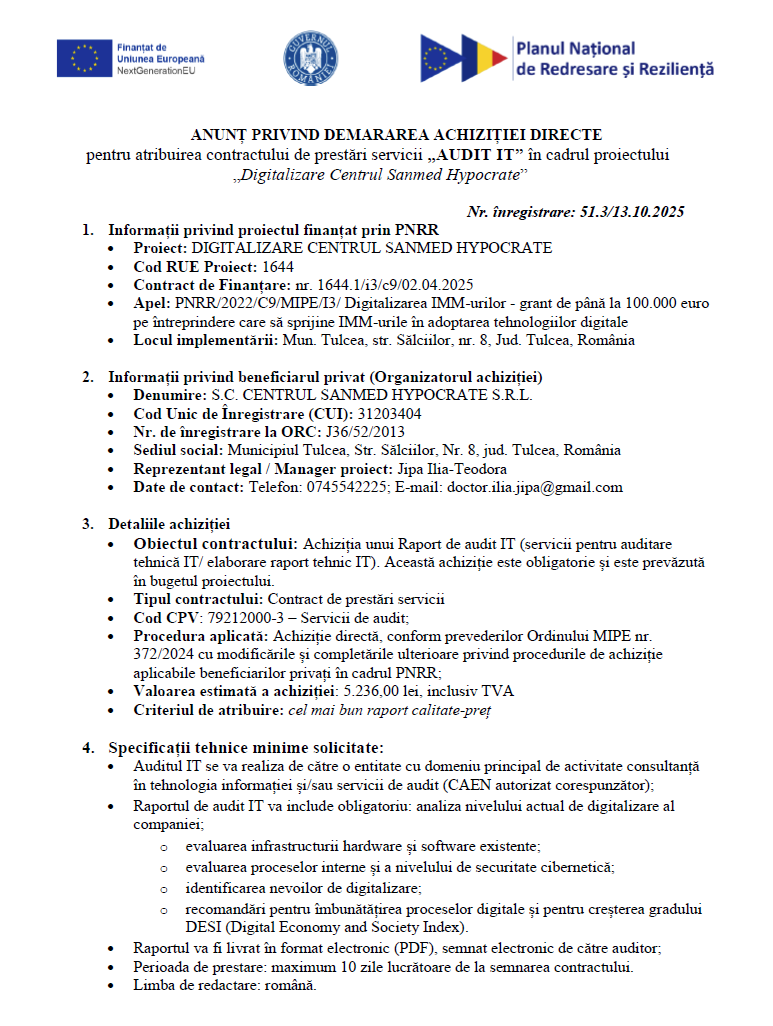 Anunțuri ANUNȚ PRIVIND DEMARAREA ACHIZIȚIEI DIRECTE pentru atribuirea contractului de prestări servicii „AUDIT IT” în cadrul proiectului „Digitalizare Centrul Sanmed Hypocrate” Ultima actualizare: februarie 19, 2026 21:50 Bude Florin-Alexandru Published: octombrie 13, 2025 Share 0 Min Citire SHARE Anunt atribuire contract AUDIT DESI Distribuie acest articol Email Copy Link Print Articolul precedent Atenție, șoferi : Ministerul Sănătății a extins lista medicamentelor care pot duce la suspendarea permisului de conducere Articolul următor 15 octombrie 2025: Întrerupere a furnizării apei la Deta între orele 9:00 – 17:00 Niciun comentariu Lasă un răspunsAdresa ta de email nu va fi publicată. Câmpurile obligatorii sunt marcate cu *Comentariu * Nume * Email * Site web Dynamics of the number of participants in the second pillar of mandatory private pension of RomaniaMediation: The Wise AdvocacyManagement Model Applicable to Metallic Materials IndustryModels of Economic AnalysisThe International Market Retirement Funds - Future Trends