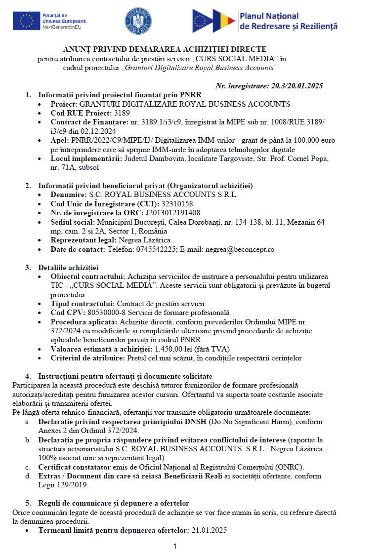 Anunțuri ANUNȚ PRIVIND DEMARAREA ACHIZIȚIEI DIRECTE pentru atribuirea contractului de prestări servicii „CURS SOCIAL MEDIA” în cadrul proiectului „Granturi Digitalizare Royal Business Accounts” Ultima actualizare: februarie 21, 2026 10:59 Bude Florin-Alexandru Published: ianuarie 20, 2025 Share 0 Min Citire SHARE Anunt atribuire contract prestari servicii CURS SOCIAL MEDIA Distribuie acest articol Email Copy Link Print Articolul precedent How MGOIT Transformed Startup Dreams into Enterprise Realities Articolul următor ANUNȚ PRIVIND DEMARAREA ACHIZIȚIEI DIRECTE pentru atribuirea contractului de prestări servicii „CURS COMPETENȚE DIGITALE” în cadrul proiectului „Granturi Digitalizare Royal Business Accounts” Niciun comentariu Lasă un răspunsAdresa ta de email nu va fi publicată. Câmpurile obligatorii sunt marcate cu *Comentariu * Nume * Email * Site web The Role of the Penalty Clause in BusinessThe Substantiation of the Principal's Liability for the Agent's ActA variety of the contract of purchase and sale. The contract of consumptionThe Effect of Organizational Culture, Leadership Style, and Functional PositionEffect of Professionalism, Competence, Knowledge of Financial Management