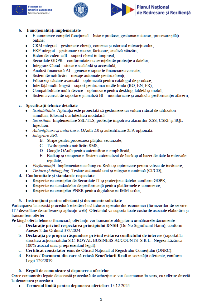 Anunțuri ANUNȚ PRIVIND DEMARAREA ACHIZIȚIEI DIRECTE pentru atribuirea contractului de prestări servicii dezvoltare „PLATFORMĂ WEB PENTRU COMERȚ ONLINE” în cadrul proiectului „Granturi Digitalizare Royal Business Accounts” Ultima actualizare: februarie 21, 2026 11:06 Bude Florin-Alexandru Published: decembrie 13, 2025 Share 0 Min Citire SHARE Anunt atribuire contract PLATFORMA PENTRU COMERT ONLINE Distribuie acest articol Email Copy Link Print Articolul precedent Nestlé România retrage de pe piață mai multe loturi de lapte praf pentru sugari NAN 1. Consumatorii sunt avertizați să nu le folosească Articolul următor „Mami, nu mai plânge, iartă-mă”. Mărturii cutremurătoare din azilul groazei din Timiș Niciun comentariu Lasă un răspunsAdresa ta de email nu va fi publicată. Câmpurile obligatorii sunt marcate cu *Comentariu * Nume * Email * Site web The Role of the Penalty Clause in BusinessThe Substantiation of the Principal's Liability for the Agent's ActA variety of the contract of purchase and sale. The contract of consumptionThe Effect of Organizational Culture, Leadership Style, and Functional PositionEffect of Professionalism, Competence, Knowledge of Financial Management