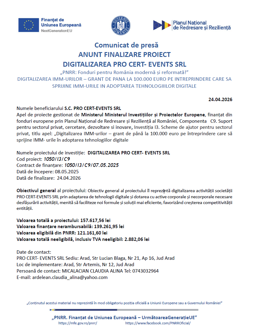 Numele proiectului de investiție: DIGITALIZAREA PRO CERT- EVENTS SRL Cod proiect: 1050/I3/C9